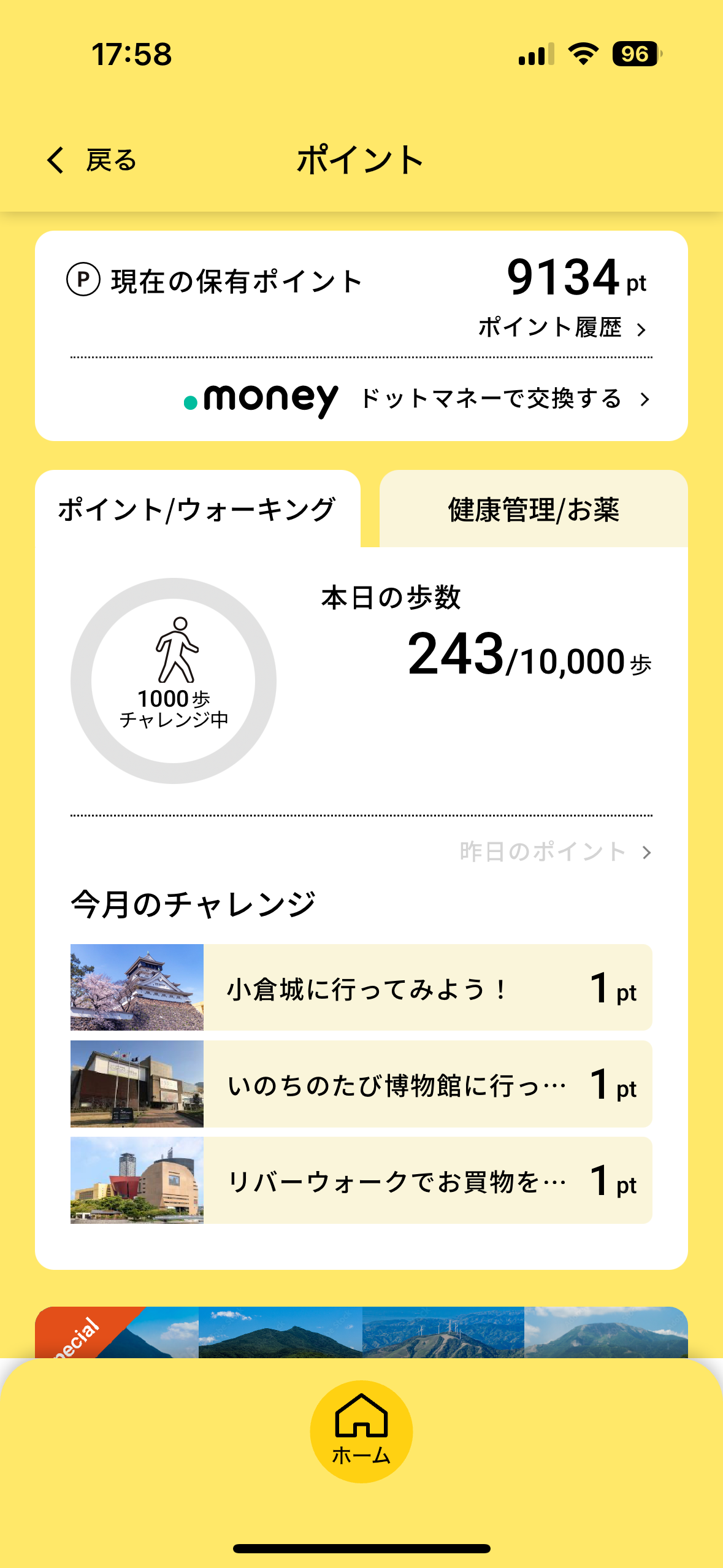 毎日のウォーキングと服薬でポイントが貯まります。累計歩数は日本百名山の標高に換算され、日々の達成感がモチベーションをアップします。