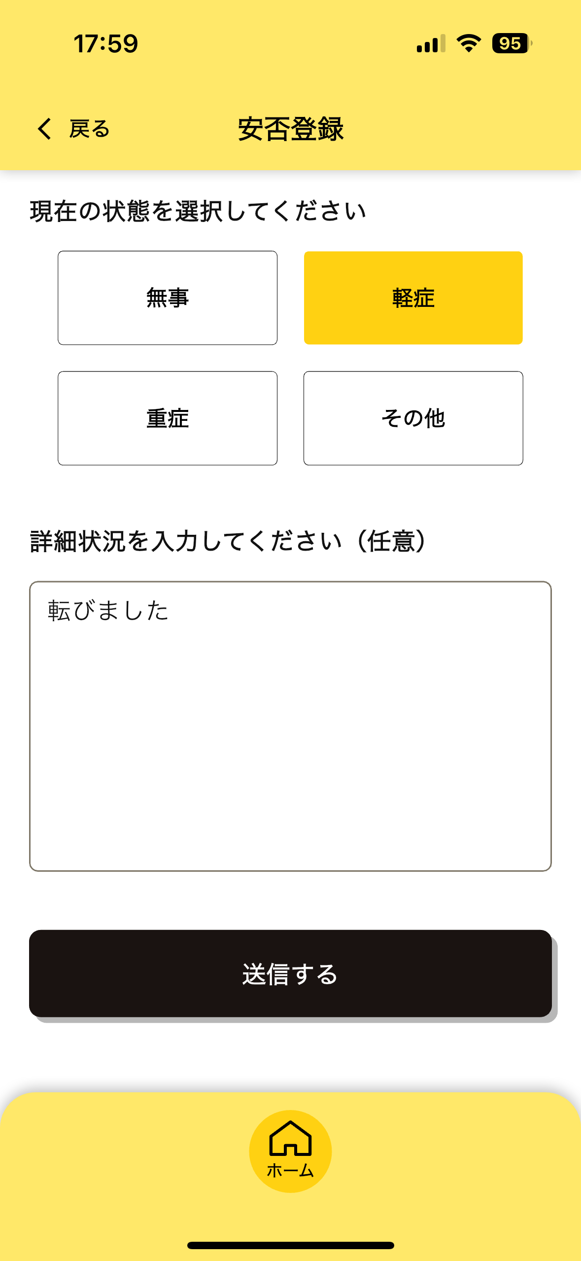 有事の際、最もシンプルに動けるアプリを目指して設計。複雑な操作なしで家族・自治体に状況を伝えられます。
